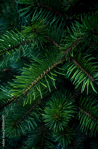 Fir branches green needle abstract background Christmas texture. Square composition.