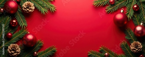 Fir branches, pine cones, baubles frame red background , christmas, frame, natural