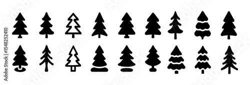 Fir tree silhouettes, isolated on white background, tree icon set, forest shapes, pine branches, conifer vector illustration, nature symbols, evergreen design, seasonal elements, landscape.