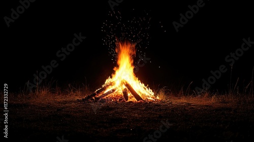 Fire flames rising and moving at dark night in dark blurred background. Camping fire suitable backdrop