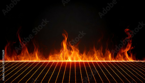 fire in the fireplace.an empty fire grid on a black background. The image should evoke a sense of power and intensity, with vibrant fire tones against the stark black.
