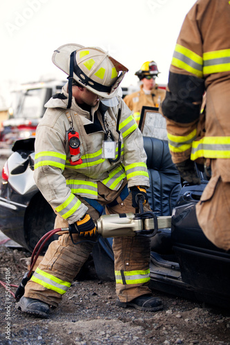 Firefighter cutting wrecked car