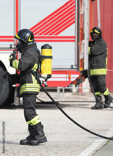 firefighter with apparatus and the fire engine