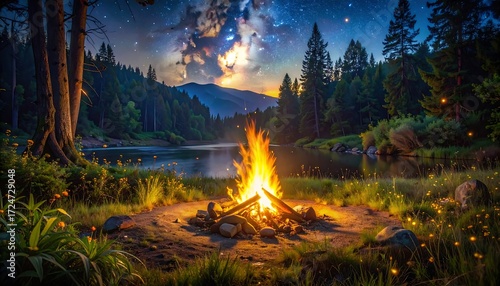 Fireflies glow near fire