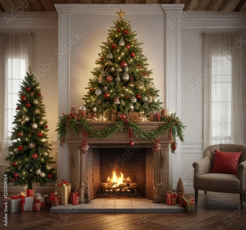 Fireplaceside Christmas tree adorned with ornaments and garlands made from pinecones and holly, winter landscape, holly branches