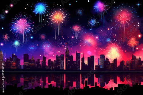 Fireworks in skyline, a fireworks display over a city skyline at night time