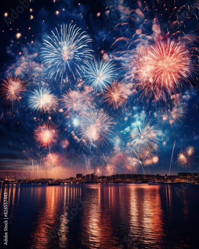 Fireworks lighting up the night sky, representing joy and excitement focus on, theme of festivity, dynamic, overlay, waterfront backdrop