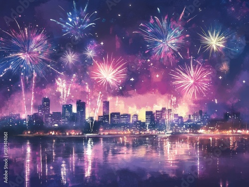 Fireworks over a city skyline at night