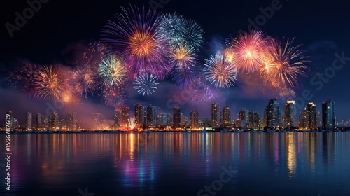 Fireworks over a city skyline at night (3)