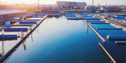 Fish farm with blue tanks during golden hour Generative AI