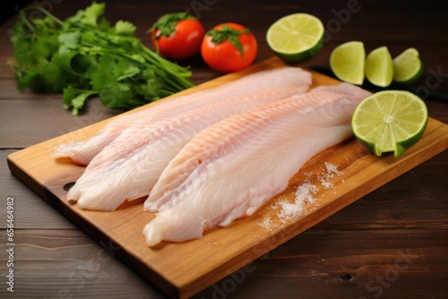 fish fillets splayed out on a wooden board with lime halves nearby