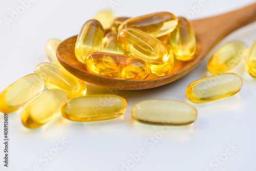 Fish oil capsules with omega 3 and vitamin D Cod liver oil omega 3 gel capsules, healthy diet concept.