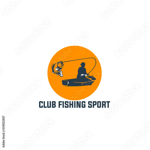Fishing logo. Bass fish with rod club emblem. Fishing theme vector illustration. Isolated on white.