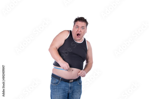 Fitness and healthy lifestyle. Funny fat guy on a diet. White background.