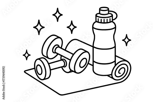 Fitness Gear Coloring Page. Sports coloring page: dumbbells and water bottle, yoga mat nearby, sparkles around, black and white
