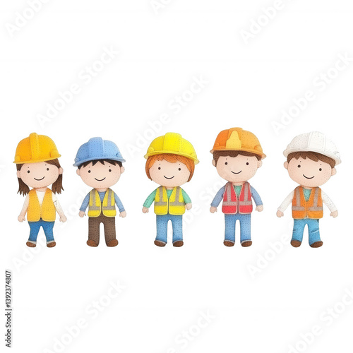 Five cartoon construction workers in bright safety gear, standing together. Each character wears a helmet and reflective vest, showcasing teamwork and safety in construction.
