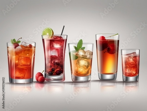 Five cocktails with ice and fresh fruit on a neutral background, ai generated