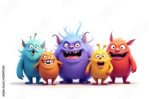 Five colorful, friendly cartoon monsters stand together. Perfect for children's books, games, or websites. AI-generated illustration.