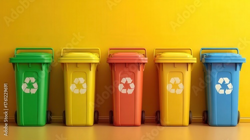 Five colorful recycling bins with the universal recycling symbol are lined up.