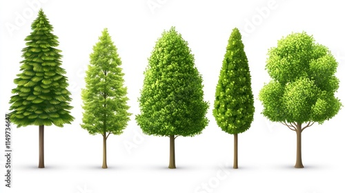 Five diverse green trees isolated on white.