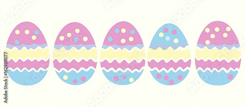 Five pastel Easter eggs, horizontally arranged, each decorated with wavy stripes and pastel dots