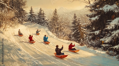 Five People Sledding Down A Snowy Hill In A Winter Forest