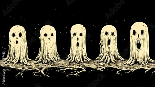 Five playful ghost figures with surprised expressions on a dark background.