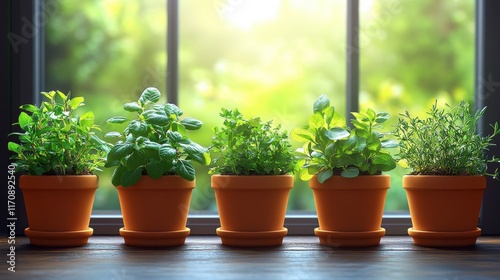 Five potted herbs on a windowsill, basking in natural light.