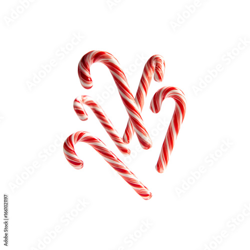 Five red and white candy canes arranged together in mid-air
