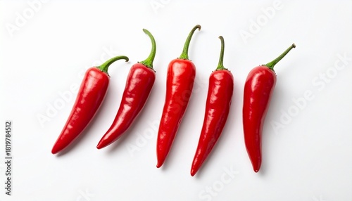 Five red chili peppers with green stems arranged on white background.