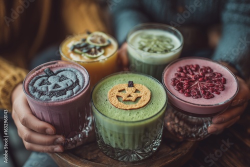 Five unique Halloween drinks are held together, showcasing vibrant colors and creative toppings, evoking a festive mood.