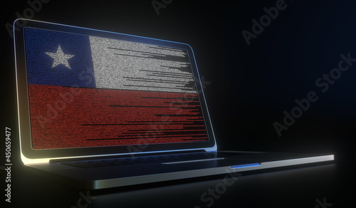 Flag of Chile made with computer code on the laptop screen. Hacking or cybersecurity related 3d rendering