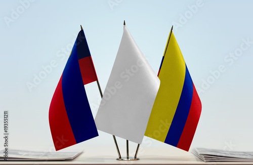 Flags of Liechtenstein and Colombia with a white flag in the middle