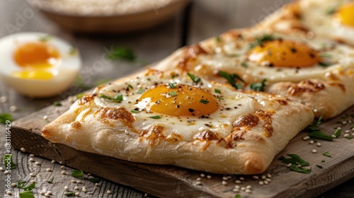 Flaky traditional flatbread topped with bright sunny-side-up eggs and sprinkled with fresh herbs, served on a rustic wooden board, visually appetizing meal.