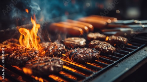 Flames rise from the grill as burgers and hot dogs cook on a warm summer evening. Friends gather around enjoying good food and laughter in a festive atmosphere.