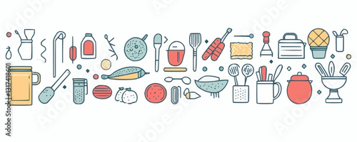Flat cooking utensils and ingredients icons set in linear style.