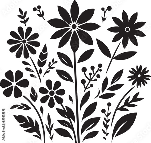 Flat design flower silhouettes, vector black color silhouette