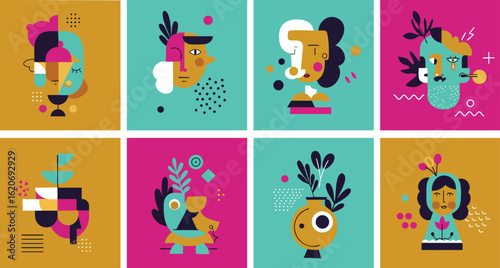 Flat Design Illustration Set Abstract Figures and Stylized Portraits