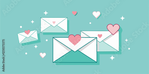 Flat Design Love Letters with Pink Hearts and White Envelopes on Teal Background for Valentine's Day
