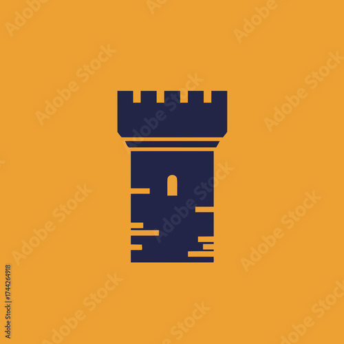 Flat Design Navy Blue Castle Tower Vector Illustration on a Vibrant Orange Background