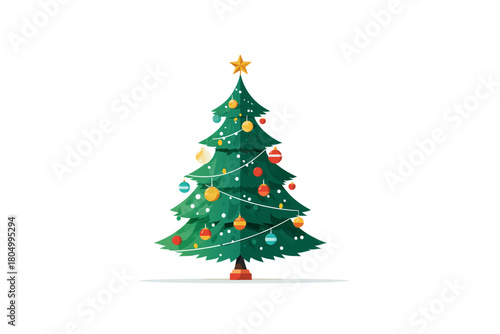 flat design vector illustration of Christmas tree with colorful ornaments, star on top, clean lines, minimal shadows, white background, modern graphic style, high detail vector art