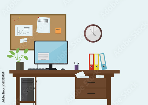 Flat design workplace with desk, computer and office equipment - vector illustration