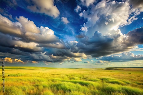 Flat grassland landscape with cloudy sky at a tilted angle