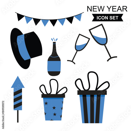 Flat icon set for New Year celebrations featuring a top hat, champagne, fireworks, gifts, and party bunting in a stylish blue and black color palette.