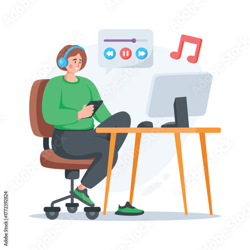 Flat illustration of a man using mobile phone during office work