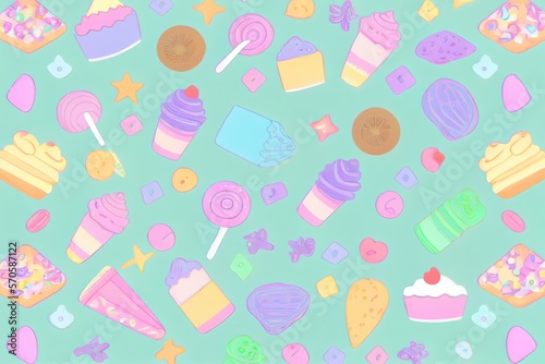Flat illustration of set of colorful cupcakes and candies. Generative AI