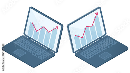 Flat isometric illustration of portable personal computer. Office and school left and right view of laptop. Business, education, work, entertainment electronic wireless equipment vector concept.