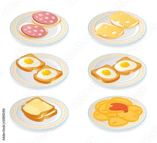Flat isometric illustration of the plates with morning meal set. The cheese and sausage sandwiches, pancakes, eggs, bread and butter on a dishes. The cooking food, breakfast snacks vector element set.