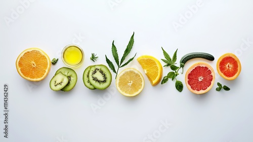 Flat lay arrangement of fresh vegetables, fruits, and hemp oil, ideal for showcasing healthy eating choices with ample photo style copy space.