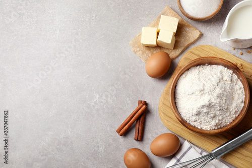 Flat lay composition with fresh ingredients for delicious homemade cake on light grey marble table. Space for text
